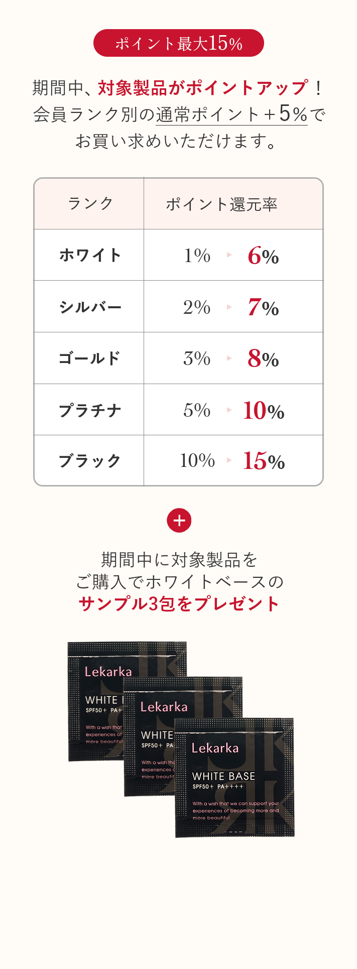 - 特典の「ホワイトベース(薬用美白UV下地) 3包」は、対象製品1点ご購入につき1セットを同梱いたします。ご購入点数に上限はございません。