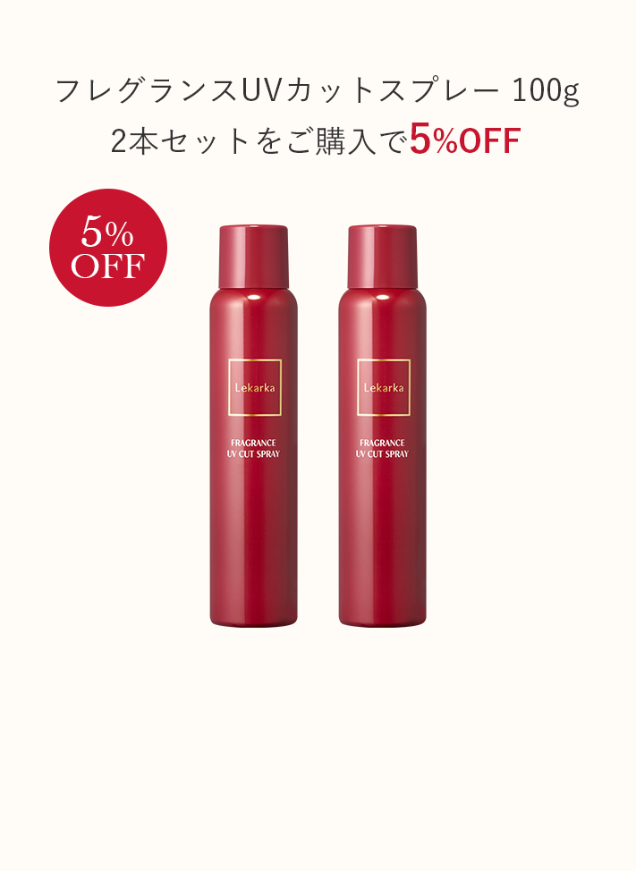 - 「フレグランスUVカットスプレー 2本セット(5%OFF)」をご希望の方は、必ず専用の製品ページからカートへお入れください。単品を2点ご購入いただいた場合は割引対象外となります。