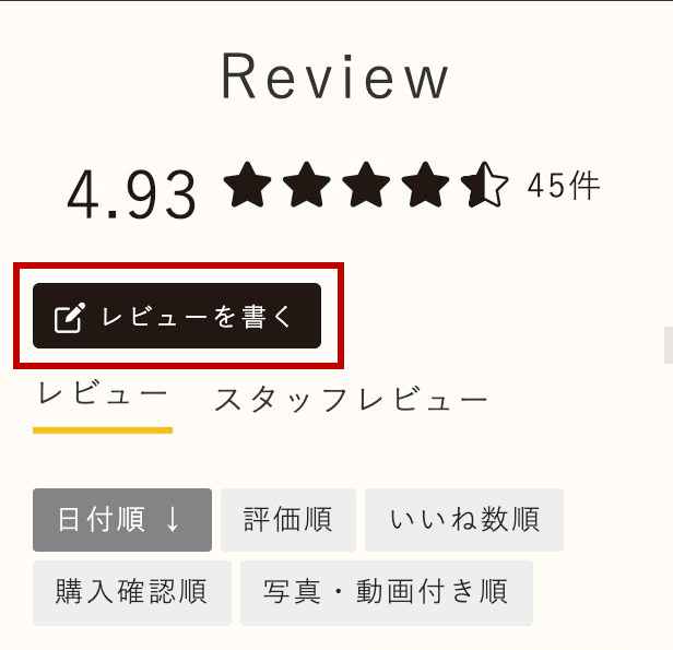 ① ラクトペプローションの製品ページ下部にある「レビューを書く」ボタンを押下します。