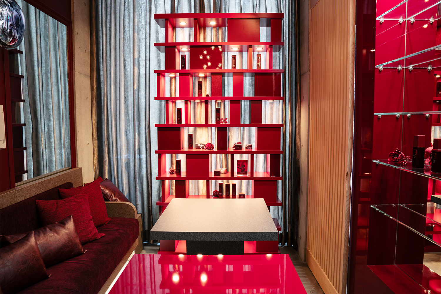 ボルドー色に設えられたこのブティックはこれまでレカルカがこだわってきた製品開発への想いを象徴した特別な空間として、お客様をお出迎えいたします。