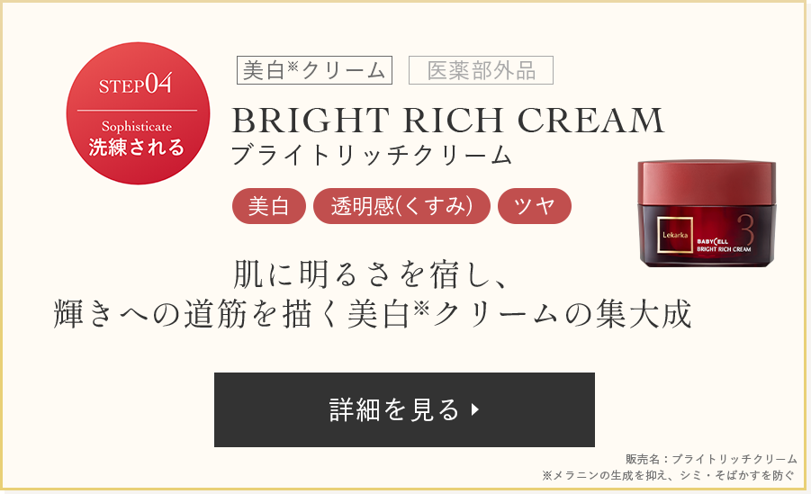 【その他の成分】紫蘭根エキス、ゲンチアナエキス、党参抽出物加水分解液、ローヤルゼリー発酵液、デイ・リリー花発酵液、アロエエキス(2)、酵母エキス(4)、テトラ2ーヘキシルデカン酸アスコルビル、酢酸DLーαートコフェロール、精製水、濃グリセリン、ジプロピレングリコール、シュガースクワラン、1,3ーブチレングリコール、自己乳化型モノステアリン酸グリセリル、トリベヘン酸グリセリル、セタノール、メチルポリシロキサン、パルミチン酸セチル、ジラウロイルグルタミン酸リシンナトリウム液、トリイソステアリン酸グリセリル、ポリエチレングリコール1540、NーステアロイルーLーグルタミン酸ナトリウム、カルボキシビニルポリマー、無水亜硫酸ナトリウム、メチルフェニルポリシロキサン、水酸化カリウム、フェノキシエタノール、パラオキシ安息香酸メチル、パラオキシ安息香酸エチル、香料